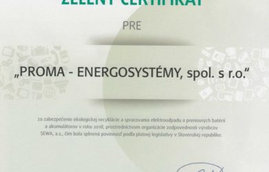 Bol nám udelený spoločnosťou SEWA „Zelený certifikát“ za zabezpečenie ekologickej recyklácie a spracovania elektroodpadu a prenosných batérií a akumulátorov v roku 2018.